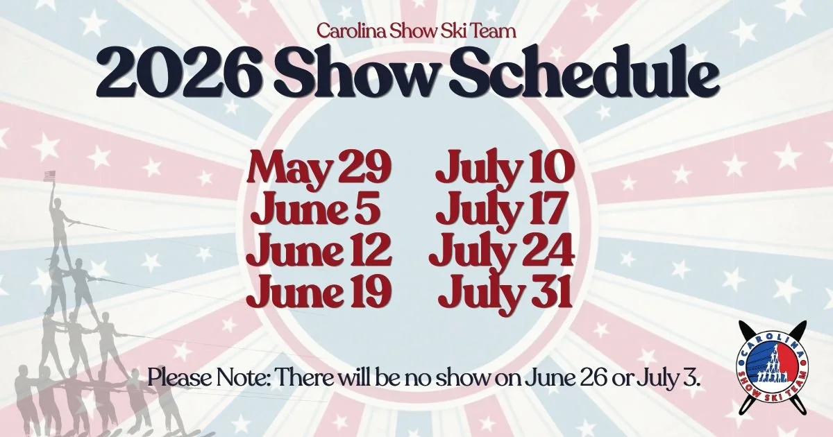 The Carolina Show Ski Team is a competitive, entertaining, family-oriented team that performs water ski shows throughout the summer at Windjammer Beach Park in Tega Cay, SC and other events around the Carolinas. We practice, perform weekly ski shows, compete in Regional and National Tournaments, and give back to our community.